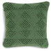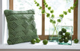 Details Polyethylene terephthalate cover, Handwoven geometric design in green, Solid green reverse, Fiber filled, Zipper closure, Made for indoor/outdoor use, Imported, Spot clean only