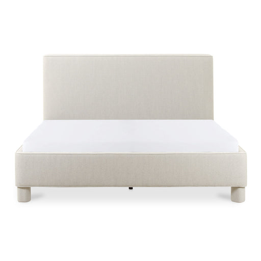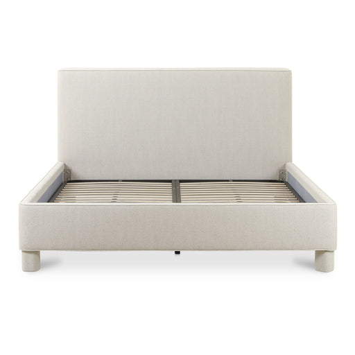 Moe's Home CollectionThe Luzon king bed is a luxurious haven upholstered in a sumptuous linen-blend fabric. Its padded headboard and robust frame are crafted from a sol...