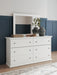 Details B139B43: Includes panel headboard/footboard and rails, Made with engineered wood (MDF/particleboard/plywood) and decorative laminate for the right balance of affordability and durability, Replicated solid white paint, Decorative laminate replicates natural or man-made material surfaces with consistent color, pattern and texture, Foundation/box spring required, sold separately, Mattress available, sold separately, Assembly required, B139B40: Includes dresser and mirror, Made of engineered wood (MDF/particleboard), Knobs with pewter-tone finish, Scalloped moulding, 6 smooth-operating drawers, Includes tipover restraint device, Mirror attaches to back of dresser; can also be mounted on wall horizontally or vertically, Safety is a top priority, clothing storage units are designed to meet the most current standard for stability, ASTM F 2057 (ASTM International), Drawers extend out to accommodate maximum access to drawer interior while maintaining safety, B139-91: Made of engineered wood (MDF/particleboard), Pewter-tone knobs, 1 smooth-operating drawer, 1 storage cubby, Scalloped moulding, Small Space Solution,