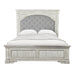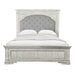 Highland Park features vintage styling in a classical bedroom collection. Sturdy construction using hardwood solids and veneers in a multi-step waxed driftwood finish with the perfect amount of distressing. The Panel bed is highlighted by a tall panel headboard and low footboard accented with heavy crown molding and elegant pilasters. A gorgeous shaped cream grey fabric inset in the headboard features button tufting and antique brass nail head trim. Requires a mattress and boxspring - sold separately.