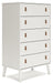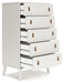 Details Made with engineered wood (MDF/particleboard/plywood) and decorative laminate for the right balance of affordability and durability, White painted finish with subtle replicated wood grain, Faux leather drawer pulls with brass-tone rivets; light brown and gray options included, 5 smooth-gliding drawers with vinyl-wrapped sides and back, Splay legs, Safety is a top priority, clothing storage units are designed to meet the most current standard for stability, ASTM F 2057 (ASTM International), Drawers extend out to accommodate maximum access to drawer interior while maintaining safety, Assembly required