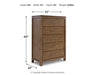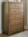 Details Made with hardwood solids, hickory veneer and MDF substrates, Light brown glazed finish to enhance the natural wood grain characteristics, Handles with aged pewter-tone finish, 5 drawers with fully finished interior, dovetail construction and ball-bearing side glides