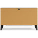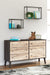 The perfect marriage of simple and contemporary style, this dresser is a charming addition to your home. It features an expressive two-tone look, with a dark charcoal finish over replicated oak grain with an authentic touch and a replicated sugarberry wood grain. Ball-bearing glides offer smooth opening and closing of the drawers, while matte black knobs and splay legs add a finishing touch.