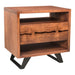 Crafted from solid Acacia wood and supported by geometric steel legs, the Madagascar nightstand offers an aesthetically pleasing rugged appeal blending rustic and industrial design. Thoughtfully designed with a single drawer between two open spaces to cater to your bedside essentials, this piece is both practical and visually captivating.