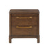 Modern style in a warm brown walnut finish, the Milan Nightstand will make a trusty bedside companion. This piece packs a lot of design in a small footprint with sunburst veneer fronts, a reverse ogee top, and a handy pull-out shelf for glasses or beverage storage. The antique bronze hardware adds additional warmth to this updated take on contemporary design.