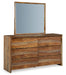 Details B790B4: Includes panel headboard, panel footboard, rails and slats , Made with sheesham wood, veneer and MDF substrate, Clear natural wood-tone finish , Headboard with beveled frame, Foundation/box spring required, sold separately , Mattress available, sold separately, Assembly required, B790B1: Includes dresser and mirror, Made with sheesham wood, veneer and MDF substrate, Clear natural wood-tone finish , Front frame with thick beveled edge, 6 smooth-gliding drawers with fully finished interior, dovetail construction and heavy duty ball-bearing side glides, Mirror attaches to back of dresser,