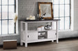 • Rustic, Farmhouse Finish: The Server has a dark brown top with a smooth finish, providing a modern contrast to the rustic design. The cabinet base is painted white and slightly distressed, enhancing the farmhouse appeal and adding character.