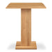 The May bar table's unique double square top and rectangular post leg create an intriguing visual harmony. Crafted from solid oak, the table exudes warmth and natural beauty. Subtle curves and angled edges offer ergonomic comfort, inviting lingering moments, effortlessly transitioning from cafe table to entryway accent.