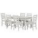 The Echo Dining Set includes a 66" table and side chairs, blending rustic charm with modern function. Crafted from solid Rubberwood, engineered woods, and Oak veneers, it offers durability and style. A multi-step driftwood finish enhances the wood grain with pale gray and white wash tones. The table features a sleek silhouette, a central storage drawer, and lift-top compartments. Classic ladderback chairs with padded upholstered seats ensure comfort and support, making this set ideal for gatherings.