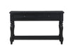 The Odessa server embodies farmhouse-inspired charm, offering a relaxed yet refined piece that serves as the perfect dining or accent piece for any room. Crafted from pine veneers and hardwood solids, this side piece wears its artful distressing with pride, culminating in a modern black stain that effortlessly breathes new life into the casual aesthetic. It's an instant update, a fresh breeze in the world of design. Two generously sized, felt-lined drawers quietly await your dining essentials and precious valuables, providing not just storage, but a touch of indulgence. Meanwhile, the solid wood legs, with their delicate turn, evoke the spirit of antiques, lending an authentic, timeless feel.