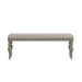Sit in comfort and style with the Summer House bench. Crafted of poplar and pine solids, this piece features a dove grey finish, grey linen upholstery, nylon chair glides to protect your flooring, and is anchored by beautifully round turned legs. This piece is available in an alternate finish, sure to be great addition in any space.