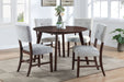 The Tioga Dining Table and Chairs set combines durable craftsmanship with modern style to create a perfect addition to your dining area. Constructed from solid Rubberwood, manufactured woods, and Cherry wood veneers, this dining set is built to last. The chairs, made of solid Rubberwood with base stretchers, offer extra stability. With its clean lines, minimalist approach, smooth surfaces, and geometric shapes, this set contributes to a sleek contemporary aesthetic. The warm finish enhances the natural beauty and grain patterns of the wood, while the button-tufted padded backrests and resilient foam cushions provide comfortable seating. Covered in easy-care, 100% polyester fabric, these chairs are both stylish and practical. The 47" round dining table is ideal for small space dining, providing comfortable seating for four and fitting well in both kitchen and dining rooms. Enhance your home with this timeless and functional dining set, ensuring years of enjoyable meals and gatherings.