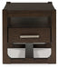 If casual contemporary style is your thing, then you'll love this end table. A wood-tone finish with a rich, dark grain contrast lends a soothing sensibility, while the unique open shelf design and spacious storage drawer add function to great form. Sleek and stylish, this piece is a fresh take on cool for the modern home.