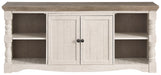 | Details | Made of pine wood, pine veneers and engineered wood, Two-tone distressed finish: weathered gray top; vintage white base, TV stand with 2-door cabinet with single-shelf storage and 2 open shelves, Aged iron-color hardware, Cutouts for wire management, Assembly required | |