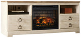 | Details | Includes TV stand and electric infrared fireplace insert (W100-101), Made with engineered wood (MDF/particleboard) and decorative laminate, Replicated whitewash and wood grained block pattern with authentic touch, Antiqued brass-tone hardware, 2 drawers, 2 media cubbies, cutouts for wire management and adjustable/removable center shelf, Electric fireplace insert provides up to 5,386 BTU/1,500W and warms up to 1,000 square feet (heats larger rooms), 7-level temperature setting; 5 levels of flame brightness, LED-lit multi flame display operates with or without infrared heat, Realistic-looking log set with dynamic glowing embers, Remote control with LED display, Timer function with programmable ranges from 10 minutes to 9 hours; overheating control device, Power cord included; UL Listed, Assembly required; simply remove the center shelf and back panel to make room for the fireplace insert | |