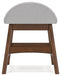 Details H615-44: Made with rubberwood solids, mango wood veneer and MDF substrate, Medium brown natural wood-tone finish, 3 drawers with fully finished interior, dovetail construction and ball-bearing side glides, Cutout for cord management, Open raceway for power cord management, Round tapered legs, H615-01: Made with solid hardwood frame, Medium brown natural wood-tone finish, Polyester upholstery, Foam cushion, H615-70: Made with rubberwood solids, mango wood veneer and MDF substrate, Medium brown natural wood-tone finish, 5 fixed shelves, Round legs,