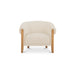 The Jones accent chair's gracefully curved back and sophisticated fold-over detail showcase transitional tub-style, while soft upholstery creates a sleek silhouette. Plush cushioning invites leisurely moments, cradled in comfort, while exposed solid rubber wood legs, enhanced by a wire-brushed finish, add warmth and character.