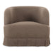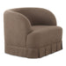 The Maren swivel chair exudes a soft, feminine aesthetic, upholstered in a warm, neutral fabric and featuring a playful yet refined box pleat base reminiscent of vintage finesse, straddling the line between contemporary form and traditional finish. With smoothly rounded corners and graceful, curving forms adding softness to the design, this piece is a study in elegance and subtlety.