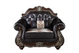 The Royal Classics Maximus Living Room Arm Chair is expertly crafted to combine timeless beauty with exceptional durability. Made from solid pine with premium polyurethane carvings, this armchair is both lightweight and robust, resistant to moisture, rot, and cracking, ensuring its intricate details endure over time with minimal maintenance. The meticulous multi-step cherry finish enhances the natural wood grain, while delicately burnished gold tipping highlights the ornate carvings, adding a luxurious touch. Inspired by traditional Baroque design, the chair features Rococo-style ornamentation, bringing a sense of regal elegance to your home. Upholstered in rich brown vegan leather, the chair is complemented by elegantly patterned, soft-textured accent pillows that enhance its refined look and offer a plush, inviting feel. Button-tufted backs and nailhead trims trace the graceful curves of the wood frame, providing exquisite attention to detail. The upholstery backs and bases are shipped separately for hassle-free transport and easy setup, making this armchair both practical and a statement piece for any sophisticated living space.