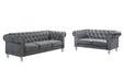 The New Classic Emma Chesterfield Velvet 2-Piece Sofa and Loveseat Set offers a soft and elegant seating solution for your living space. The 100% polyester velvet fabric provides cozy and indulgent seating, while the tufted backs and arms, adorned with glimmering crystal buttons, add a touch of glam without compromising comfort. Upscale accents, including silver nailhead trim on the rolled arms and silver turned bun feet, enhance the velvet fabric. Shipped unassembled for easy placement, this set is small space-friendly, fitting well into any home with its lower profile height. Enjoy full-size seating with supportive full foam cushions, ensuring ample support and comfort.