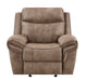 The Nashville cocoa Glider Recliner brings incredible comfort to a room whether reclined or closed. The built-in Glider mechanism adds a comforting gliding motion to the chair while the outside manual lever puts you in a full recline at the flip of a switch. The faux-suede cover is soft to the touch and warms up the room with its cocoa colored cover. Generous arms in an overlapping design add ample padding to complement the lavish seat cushioning for a relaxing reclining experience.