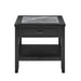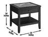 Transitional styling with a dark, smoky design, the Garvine End Table dresses up a living area or bedroom with easy care style. A gray Sintered Stone top adds an elegant easy-care accent to the top with enhanced performance features including moisture, scratch and heat resistance. A bottom shelf offers display or storage options while a drawers offers valuable storage for remotes, electronics or other items.