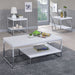 A contemporary collection of tables featuring chrome bases and white tops. An asymmetrical bottom shelf adds function as well as style to the collection and the Silvershield® top adds beauty and texture to the cocktail and end table.