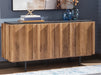 Details Doors, sides and interior made with solid mango wood, Back made with mango veneer and engineered wood substrate, Light brown finish, Engineered wood top with charcoal gray finish, Metal legs with black finish, 4 doors, 3 fixed shelves, Openings in back for electronics, Minor assembly required, simply lay flat and attach feet