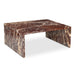 The bold simplicity of the waterfall design speaks volumes with the Rosa coffee table's versatility. Crafted from beautiful Rosso Levanto marble, renowned for its vibrant red hue and striking gold veining, each piece is singularly impactful. This piece commands attention as a statement of natural elegance.