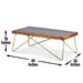 Solid mango wood in a warm pine finish is inlaid with a brass X pattern atop a modern brass finished iron base. Simple yet so stylish.