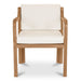 The Nellie outdoor dining chair elevates outdoor dining with comfort and enduring style. This foundational piece features a solid teak frame with quick-dry foam cushions upholstered in white 100% Olefin fabric. The curved back with gradually sloping arms creates a welcoming silhouette whose form is durable and weather resistant.