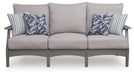 This outdoor sofa prioritizes versatile style and comfort, all while providing the durability you need alfresco. Crafted with a sturdy wood-look material in gray, it withstands the elements with ease. Cleanable and UV-resistant Nuvella® fabric rounds out the piece with added function.