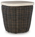 Add luxury, convenience and durability to alfresco fun. This outdoor end table captures the textural beauty of wicker while withstanding the elements, from rain to shine. With its marble-look aluminum top, you can stylishly keep your pool-side drinks or reads in reach.