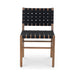 The Mira outdoor dining chair features a solid teak frame intricately adorned with contemporary webbing-strap detail, adding captivating textural interest. Its alluring woven design lends an air of openness and intricate detail to any setting. Over time, the teak and oils imbued in the wood gracefully weather into a distinguished silver-grey patina.