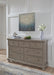 Satisfying your taste for tradition, this dresser sports serene sophistication. Forever classic design details—inlaid panels, silvertone patina hardware and bun feet—are so easy to love. A burnished light gray finish elevates the look with modern sensibility. Seven roomy drawers keep your wardrobe organized in style, and a hidden pull-out tray behind the top middle drawer puts your small valuables out of sight.