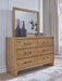 | Details | Includes dresser and mirror, Made with hardwood solids, mango wood veneer and MDF substrate, Light wood-tone finish, 6 smooth-gliding drawers with fully finished interior, dovetail construction and heavy duty ball-bearing side glides (top drawers felt lined) , Metal drawer pulls with darkened bronze-tone finish, Mirror attaches to back of dresser | |