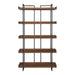 A sleek contemporary style, constructed with an iron frame and solid acacia with a light brown stain.