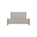 - Classic four post bed. Soft textured fabric upholstery pairs with rustic finish leg