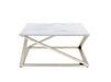 A mixed media table collection with a clean contemporary style, Zurich features a knife-edge faux marble top with an asymmetrical metal base that is as interesting as it is functional. Matching end tables complete a collection that will brighten any room.